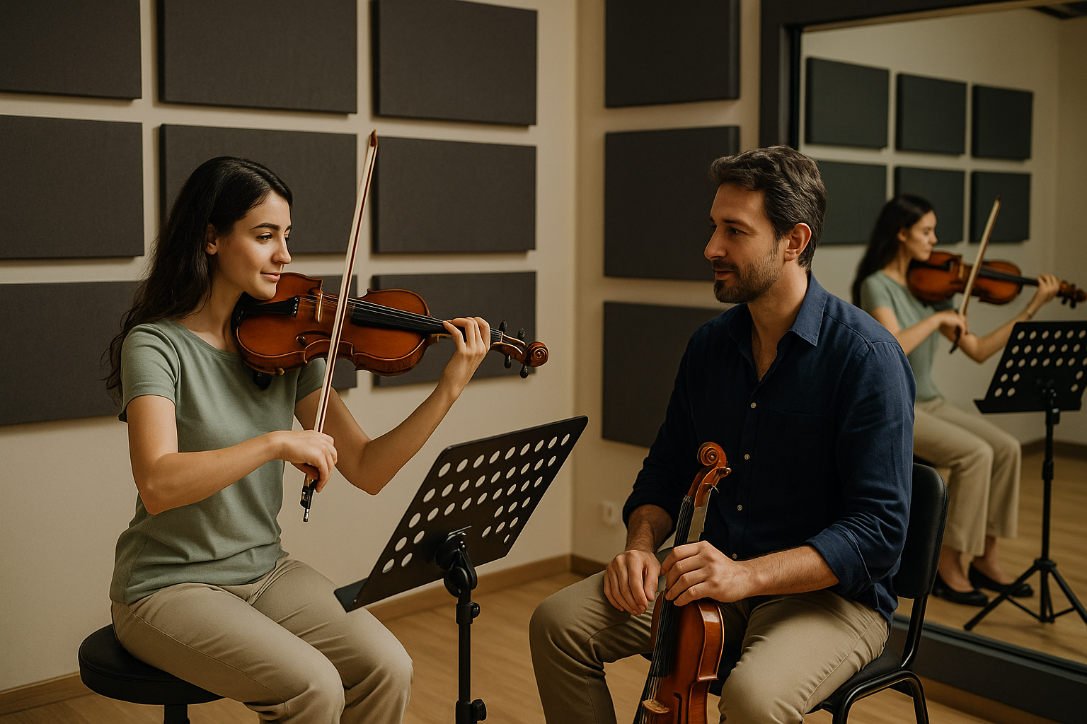 - Doğru Akustik ve Ses Yalıtımı: Dersliklerimizdeki akustik paneller, sesin odada doğru yankılanmasını sağlayarak kemanınızın gerçek tonunu duymanıza olanak tanır. İyi bir akustik keman dersliği, tonunuzu geliştirmenin temelidir. Ayrıca, her odanın ses yalıtımlı keman odası olması, komşuları rahatsız etme endişesi olmadan özgürce çalışmanızı sağlar.