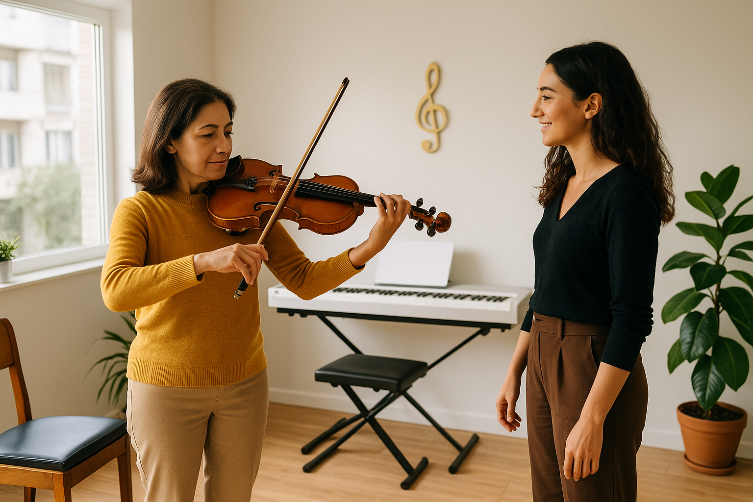 - Yüz Yüze Keman Dersi: Eğitmenle aynı fiziksel ortamda olmanın getirdiği anlık fiziksel müdahale ve daha derin iletişim imkanı sunar. Bu deneyim, genellikle online derslere göre bir miktar daha yüksek bir yatırım gerektirir.